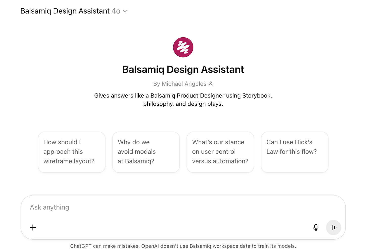 “A custom GPT is like cloning part of your domain expertise into an always-on assistant. For us at Balsamiq, that means feeding it our design principles, Storybook docs, usability heuristics, and other open-source content. I like to use our Wireframing for Everyone book.”
